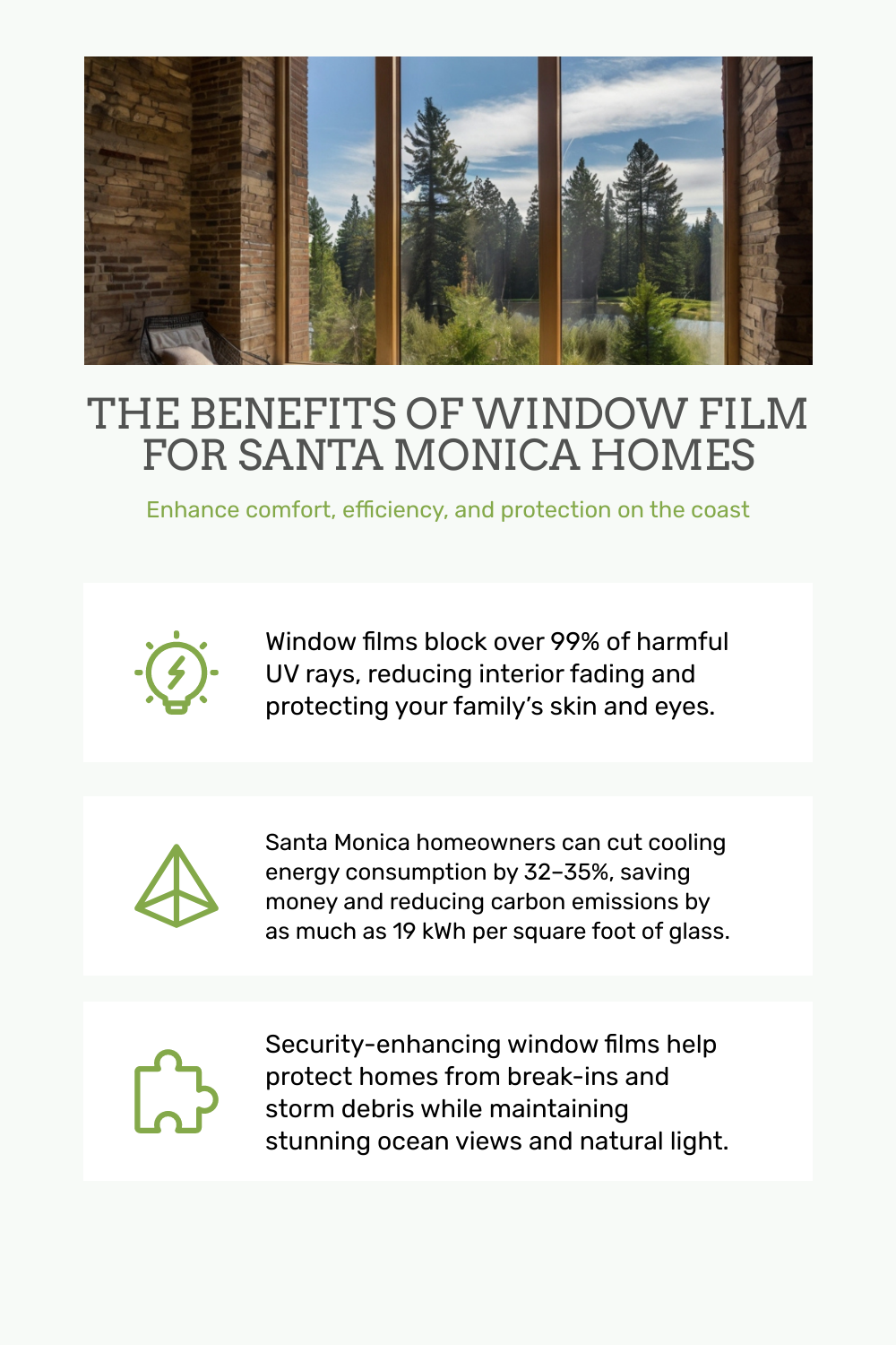 Living by the beach in Santa Monica provides breathtaking views and abundant natural light but also comes with high exposure to ultraviolet rays and potential security risks. Here’s how our window films can help: